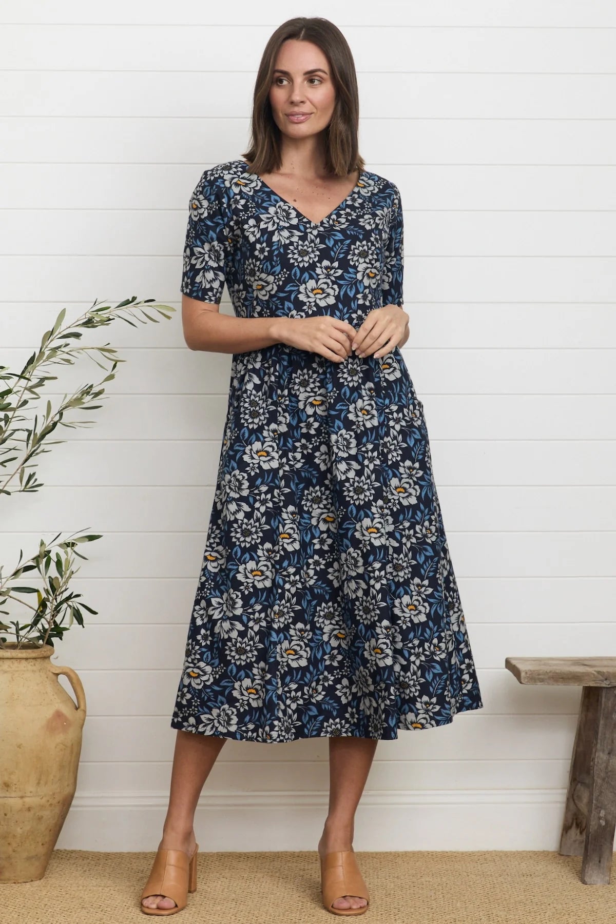 Fall in love with our Alice Dress, a perfect blend of elegance and ease. This Midi dress features a flattering V-neckline and a fitted bodice that gracefully transitions into a flared skirt, creating a timeless and feminine shape.