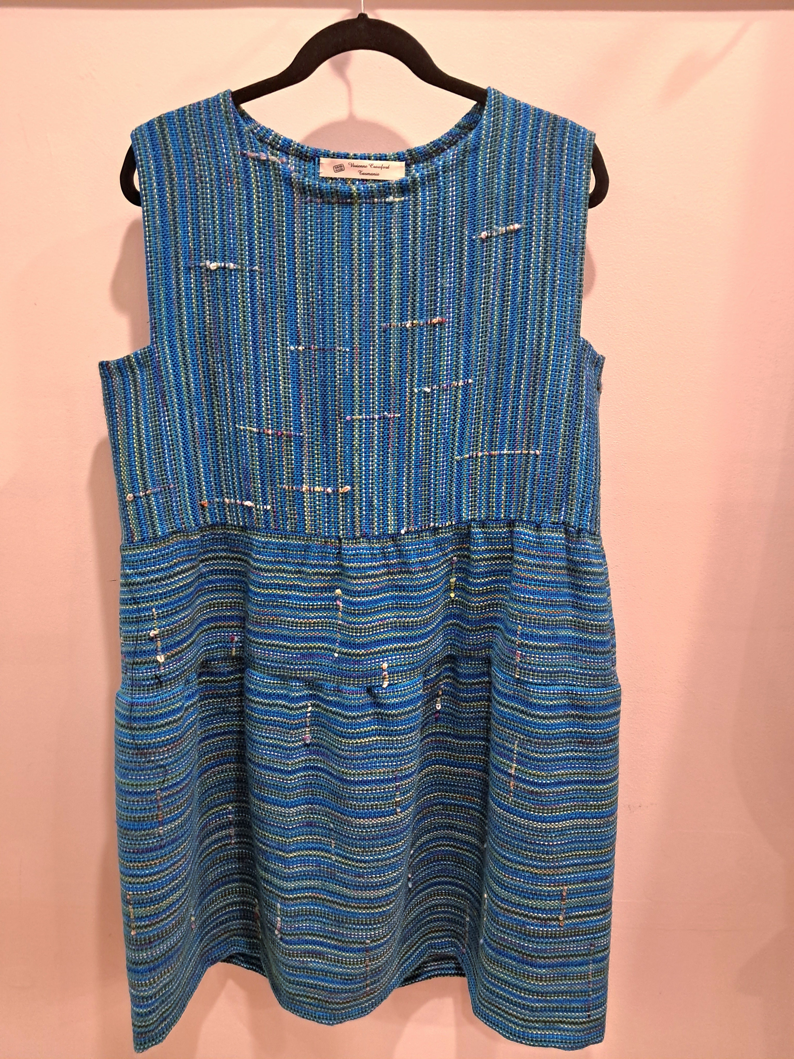 A fun woven pinafore designed and constructed by local maker Vivienne Crawford. Bright blue with multicoloured inlays, it is a stunning pop of colour perfect for layering, Size 14, 100% wool, hand wash only.