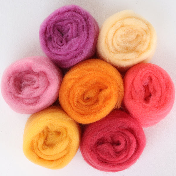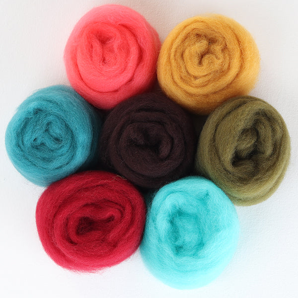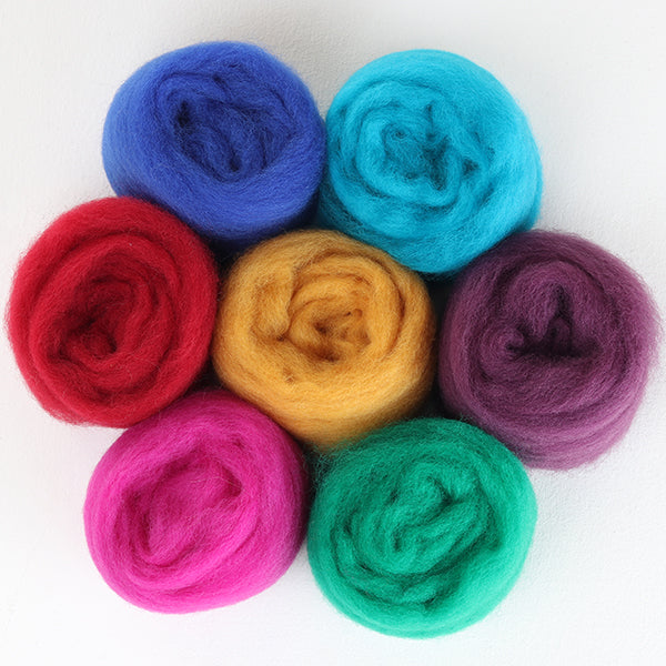 Convenient seven colour packs of 30 micron Corriedale sliver pre-packaged in 100gm bags.