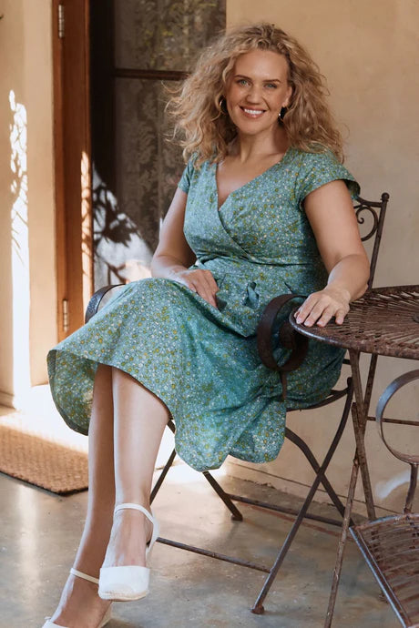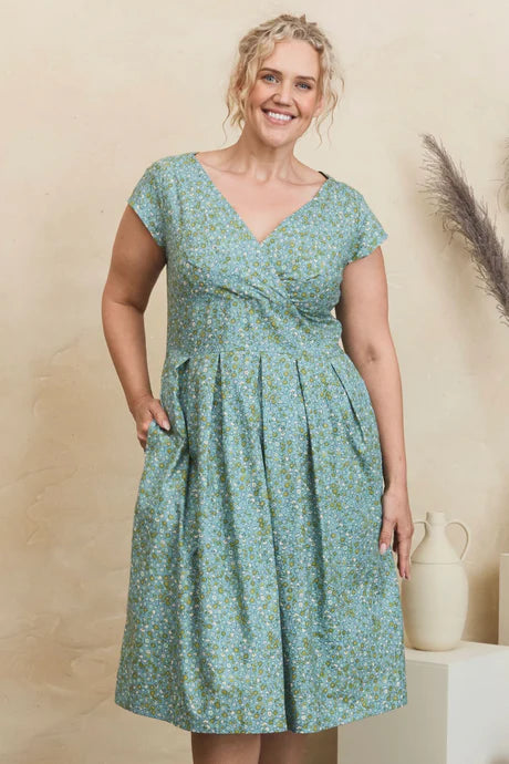 Our hero piece of this collection, a vintage inspired dress with its flattering tailored waistband & crossover bodice. The Eliza Dress with its delicate cap sleeves, pleated skirt & pockets is a definite must have item this Summer.