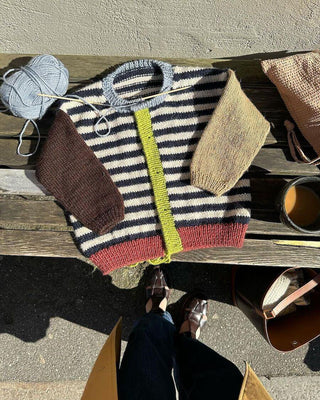 The multicolored Holger Cardigan is knitted in Peer Gynt by Sandnes Garn in the colors Almond [2511], Night sky [5591], Cacao nibs [3091], Camel [2542], Spiced apple [3854], Above the clouds [6050] and Sunny lime [9825].